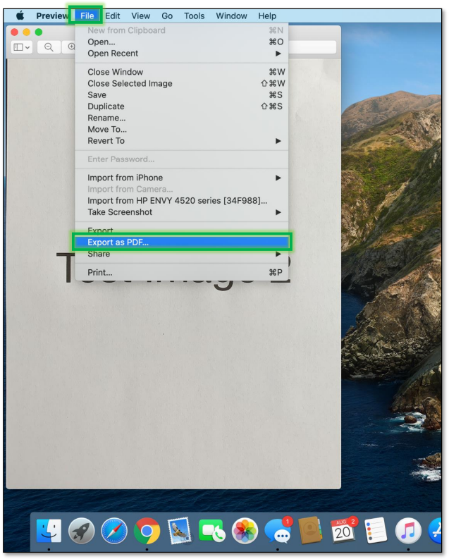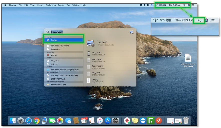 Open the image you want to convert using the Preview application. If you cannot find Preview, use Finder (magnifying glass in the top-right corner), type Preview, and select it from the Top Hit.
