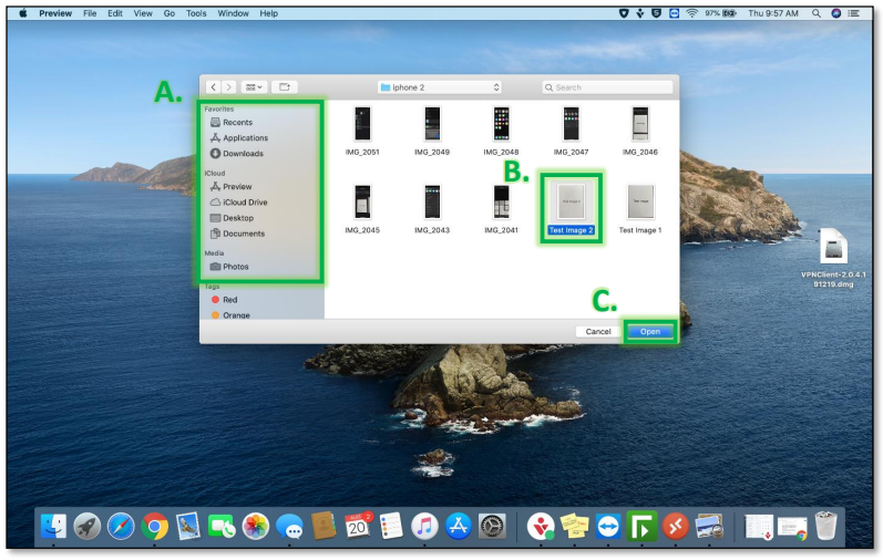 Locate (A) and select the image (B) you want to convert, then select Open (C). Note: You may select multiple images to convert into a single PDF.